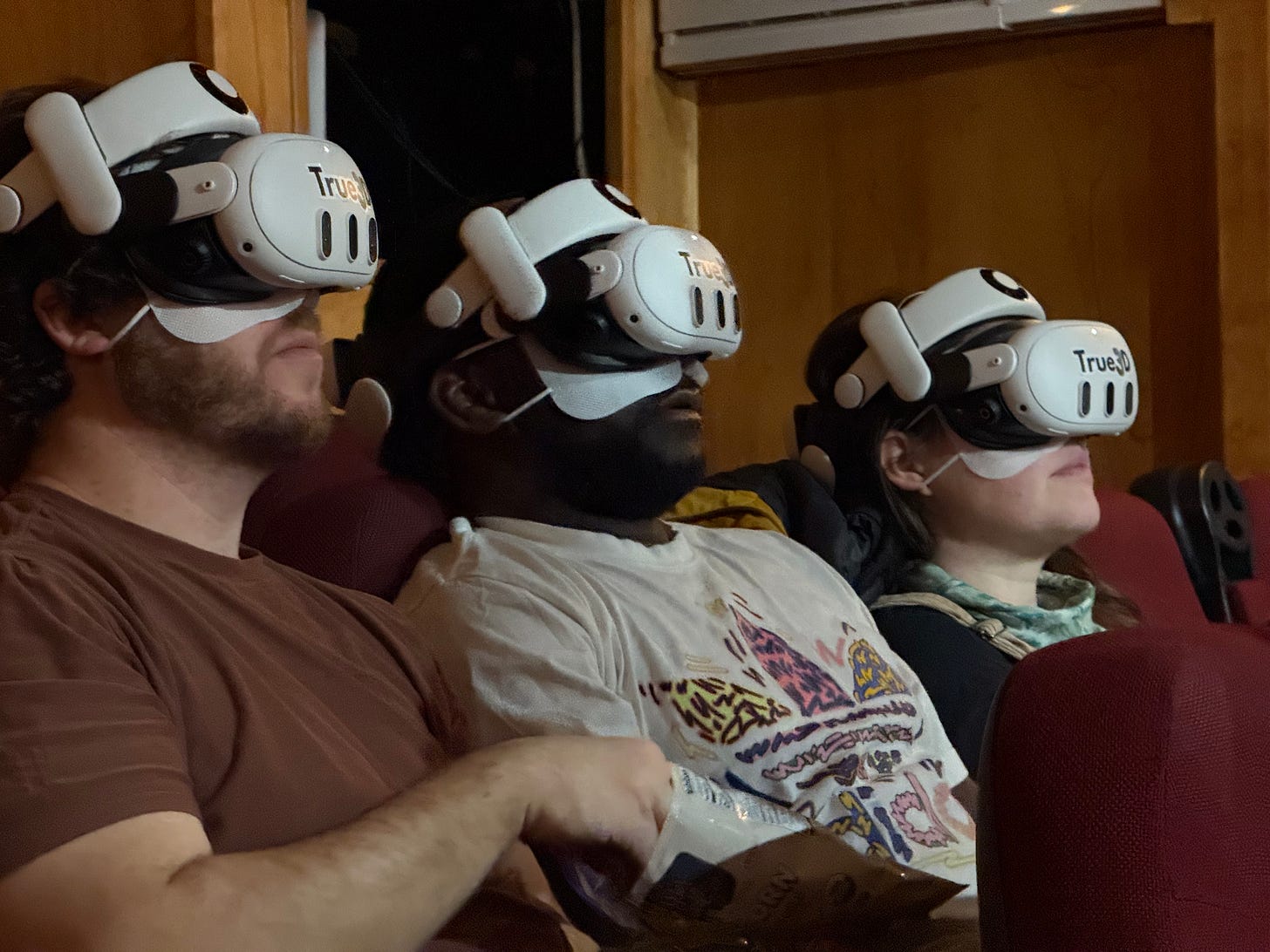 At the bar, the True3D organizer I spotted with his Quest 3 said he had to get a permit to sell me fresh popcorn. So I bought two beers instead, took them into the screening room, and sipped them up to the 10-minute intermission after the movie’s biggest scare.