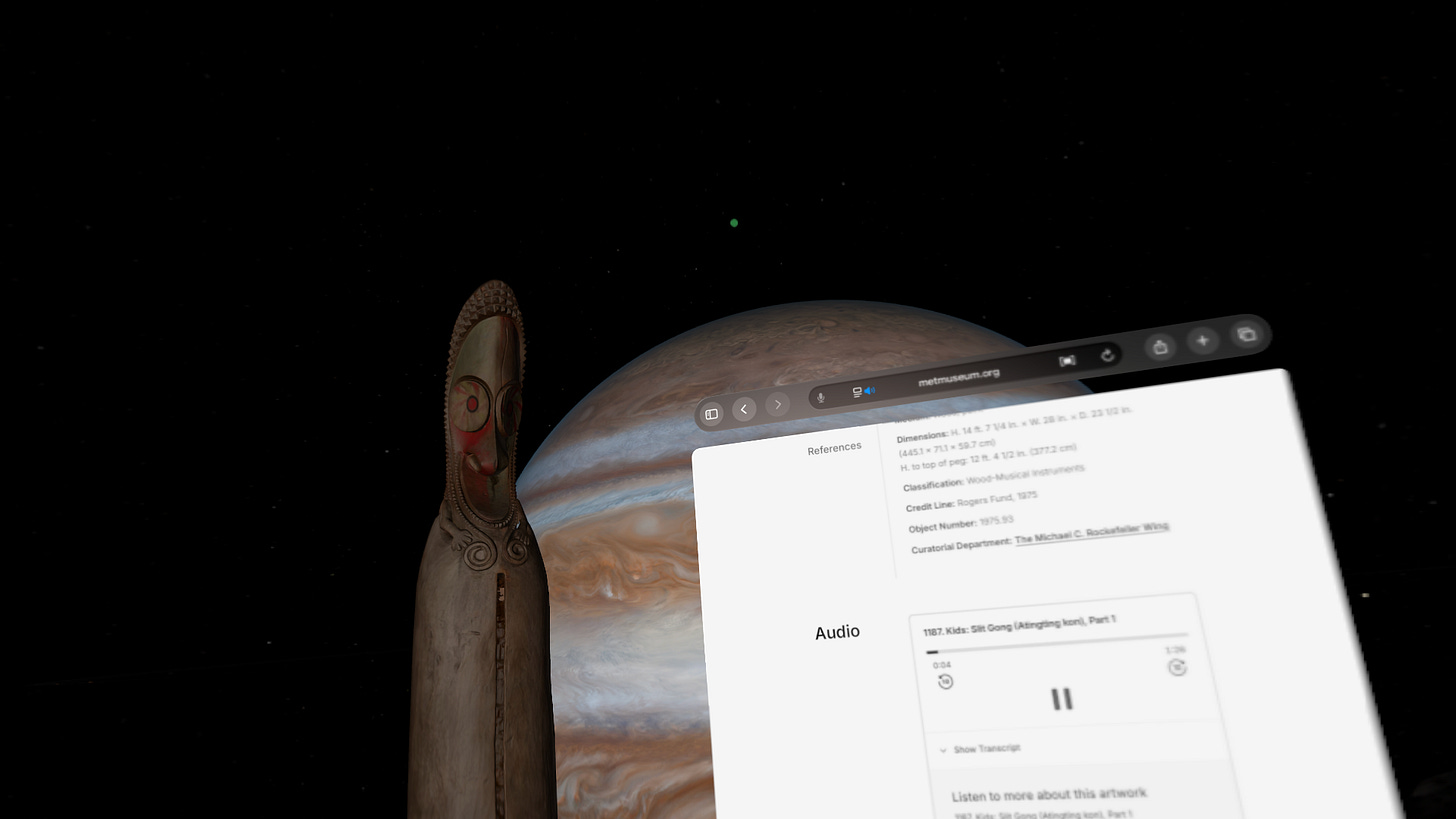 At one end of VR there is bringing yourself to a physical museum to scan objects on foot with an iPhone that you can experience later in a headset, and at the other end the art literally comes to you in your headset, for perusal at a place, time, and with people of your choosing. My friend and I weren’t even in the same physical location in our Vision Pro headsets, yet The Met’s art was able to travel from its physical confines through the open Web and become the centerpiece of our shared reality for a few minutes.